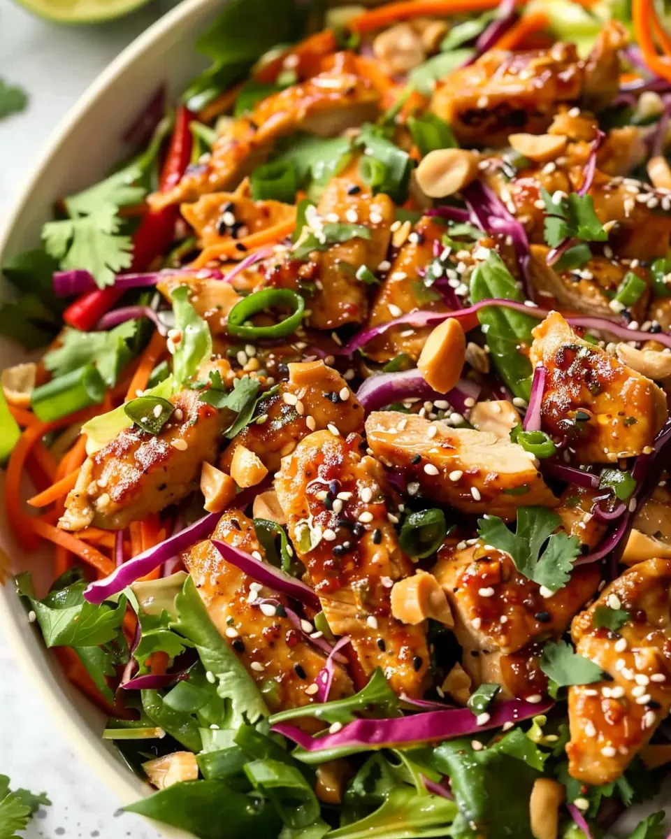 Enjoy your Asian Chicken Crunch Salad — a delightful mix of crisp greens, juicy chicken, and a dressing that brings everything together in one harmonious bite!