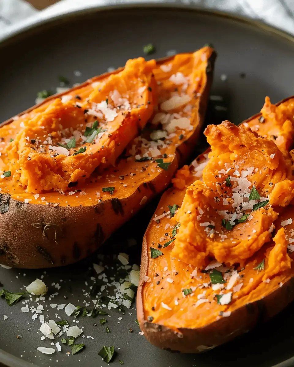 Once your sweet potatoes are done, carefully take them out of the oven (watch out—they’ll be hot!). Let them cool for a few minutes. Then, slice them open and give them a light fluff with a fork.
