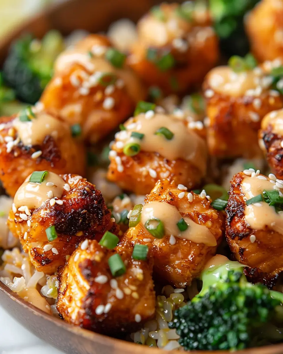 - Generously Drizzle the Sauce: Take your Bang Bang Sauce and give your salmon bites a nice drizzle. Be generous!