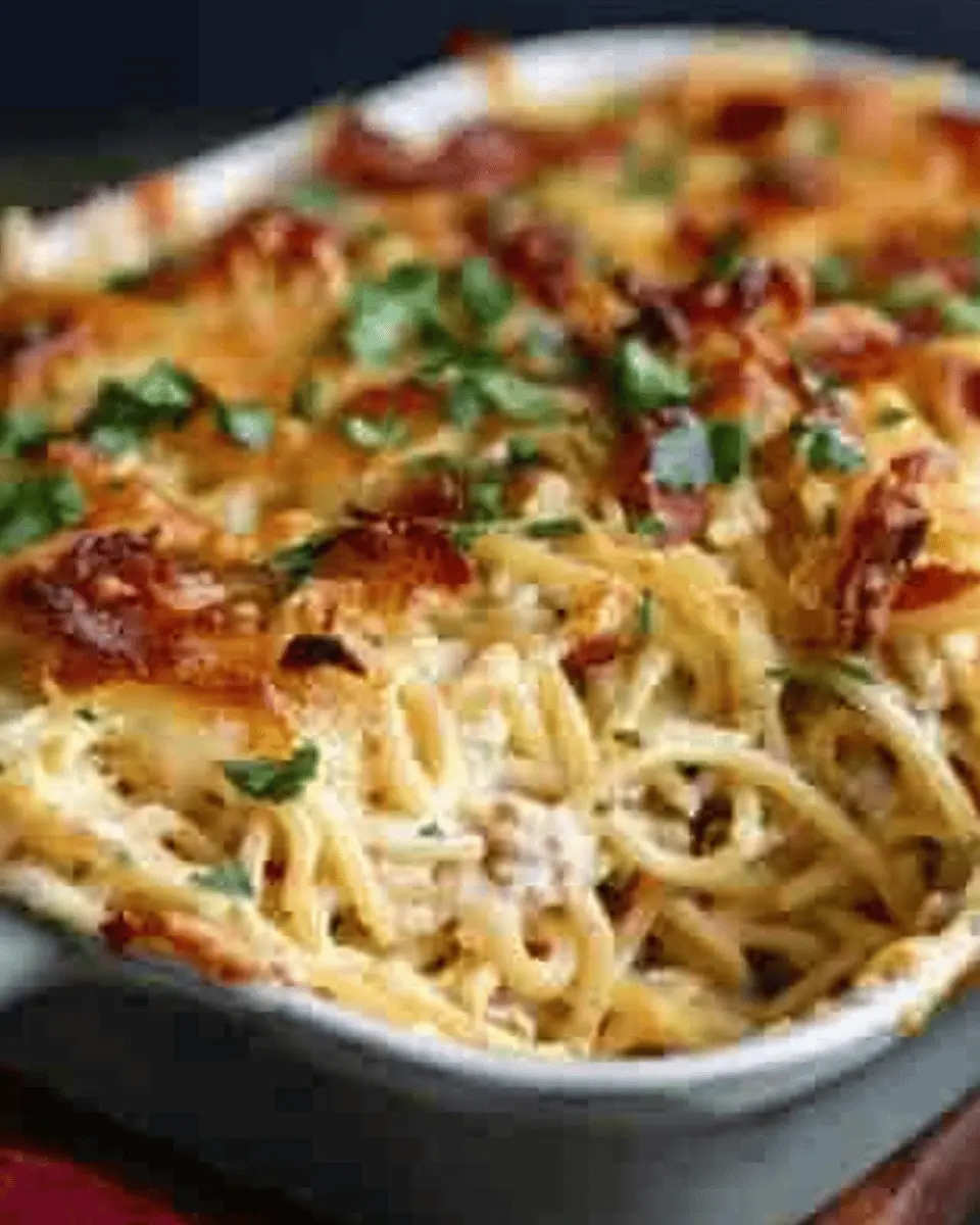 A delightful and creamy spaghetti bake that features turkey bacon and chicken ham, bringing a Southern twist to a classic dish.