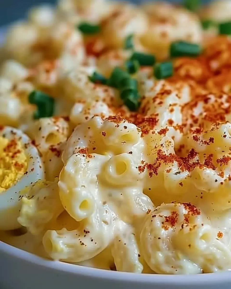 A creamy and flavorful macaroni salad made with deviled eggs, turkey bacon, and chicken ham.