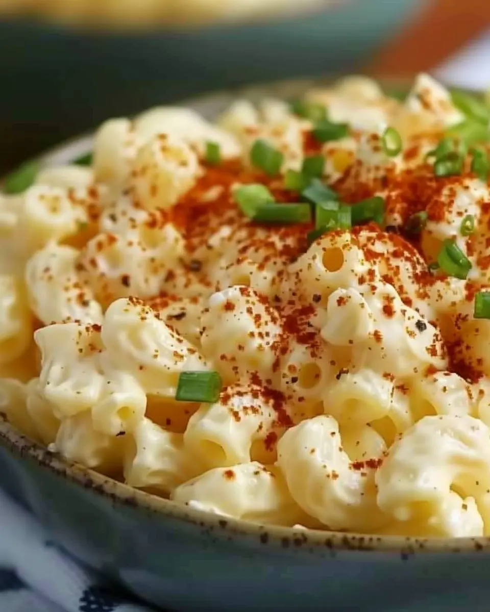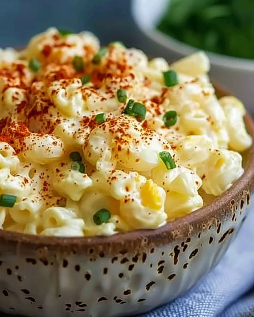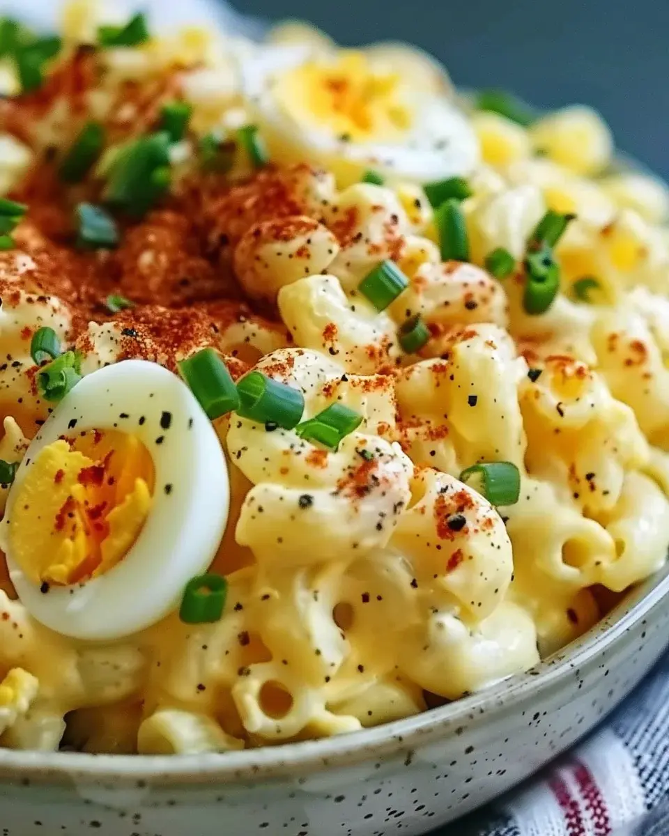 A creamy and flavorful macaroni salad enriched with the classic taste of deviled eggs.