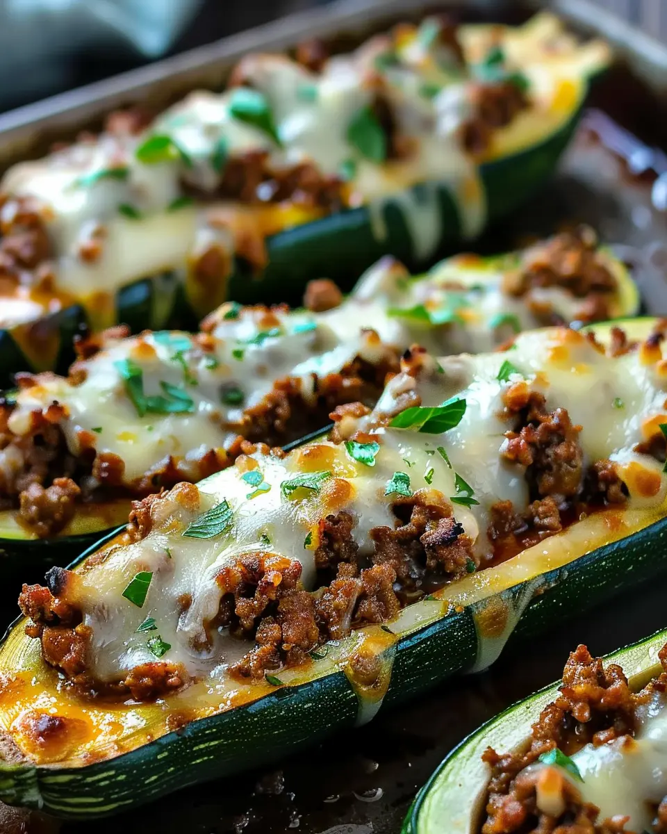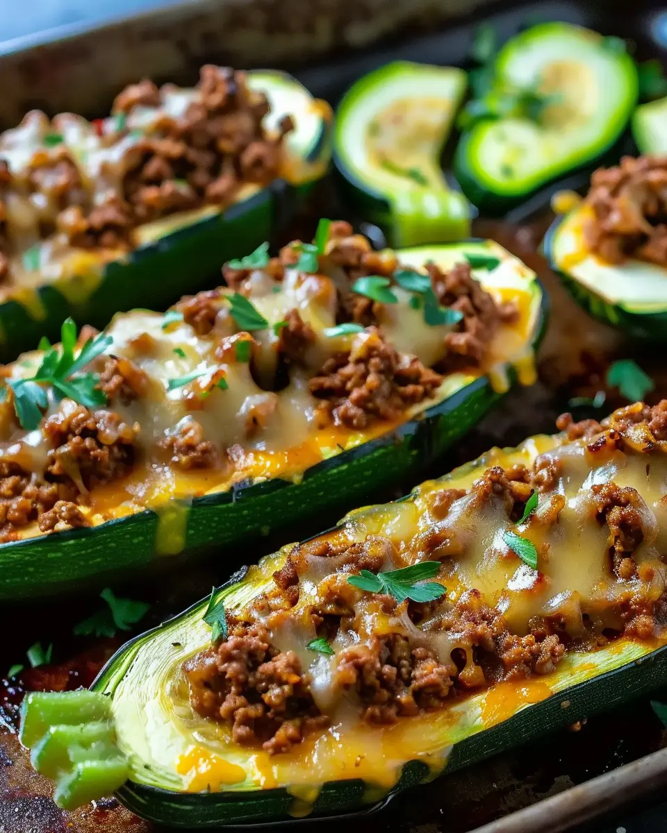 Stuff your hollowed zucchini with the beef and veggie mixture, then top with cheese before baking. The creamy texture of the cheese pairs beautifully with the crunch of the zucchini, and you can garnish with fresh cilantro or avocado for added freshness.