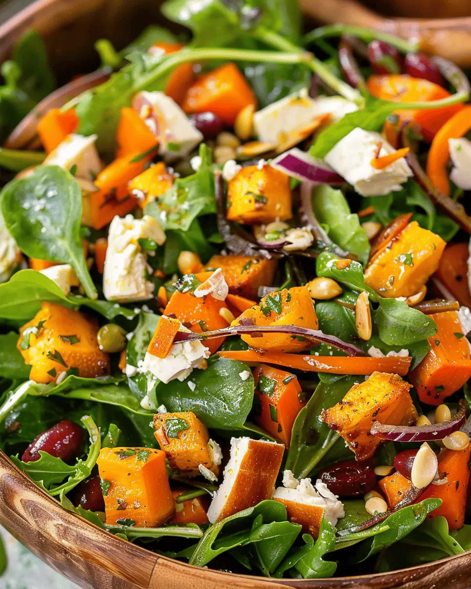 The heart of any flavorful Fall Harvest Salad is the roasted sweet potatoes. Not only do they add natural sweetness, but their creamy texture is a perfect complement to the crunchy ingredients that follow.