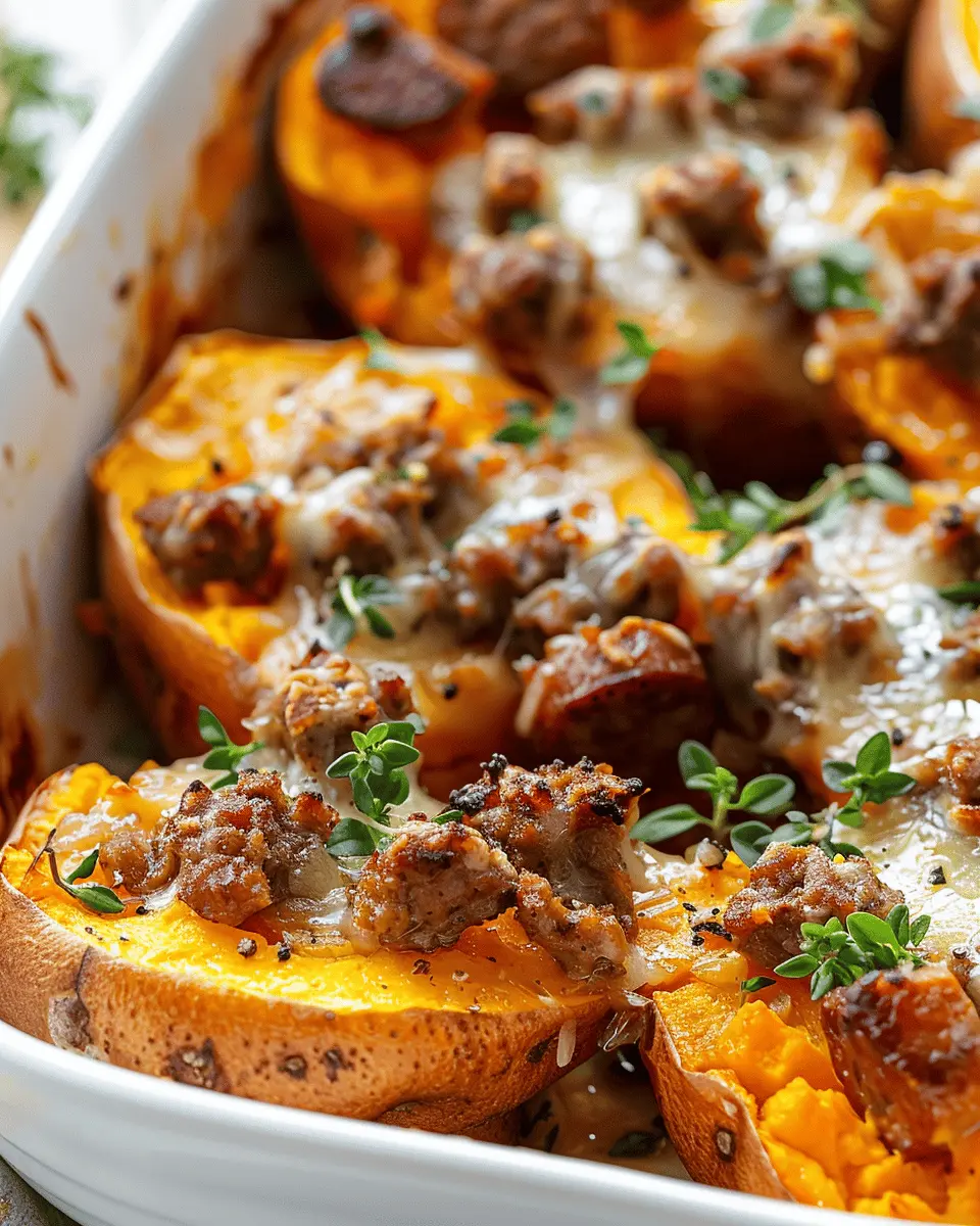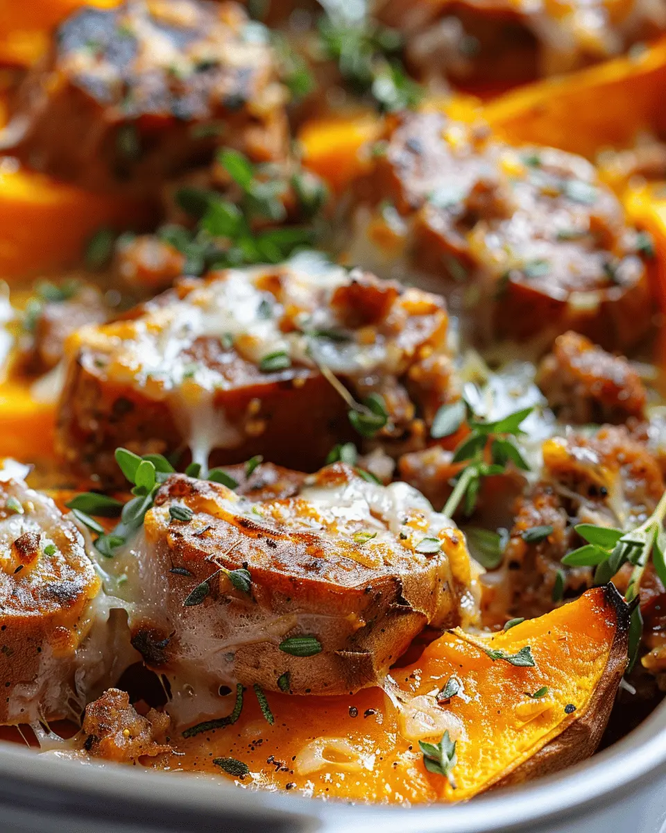 A warm and inviting dish perfect for autumn, featuring sweet potatoes and sausage.