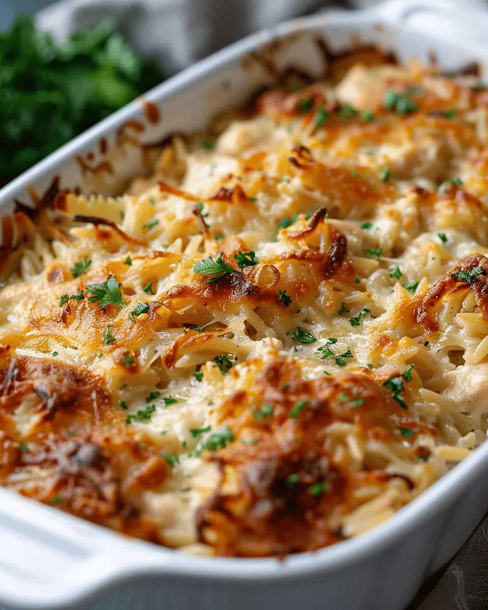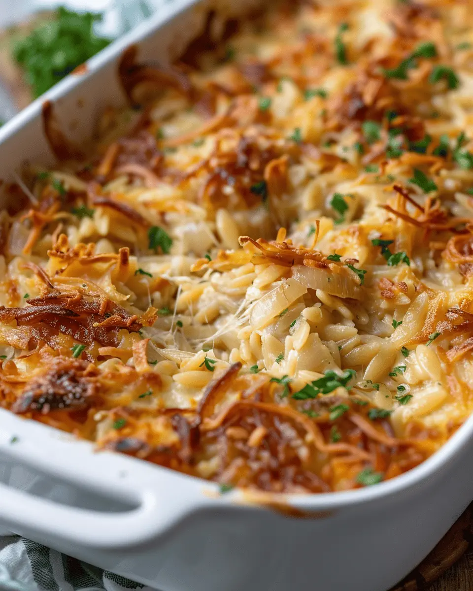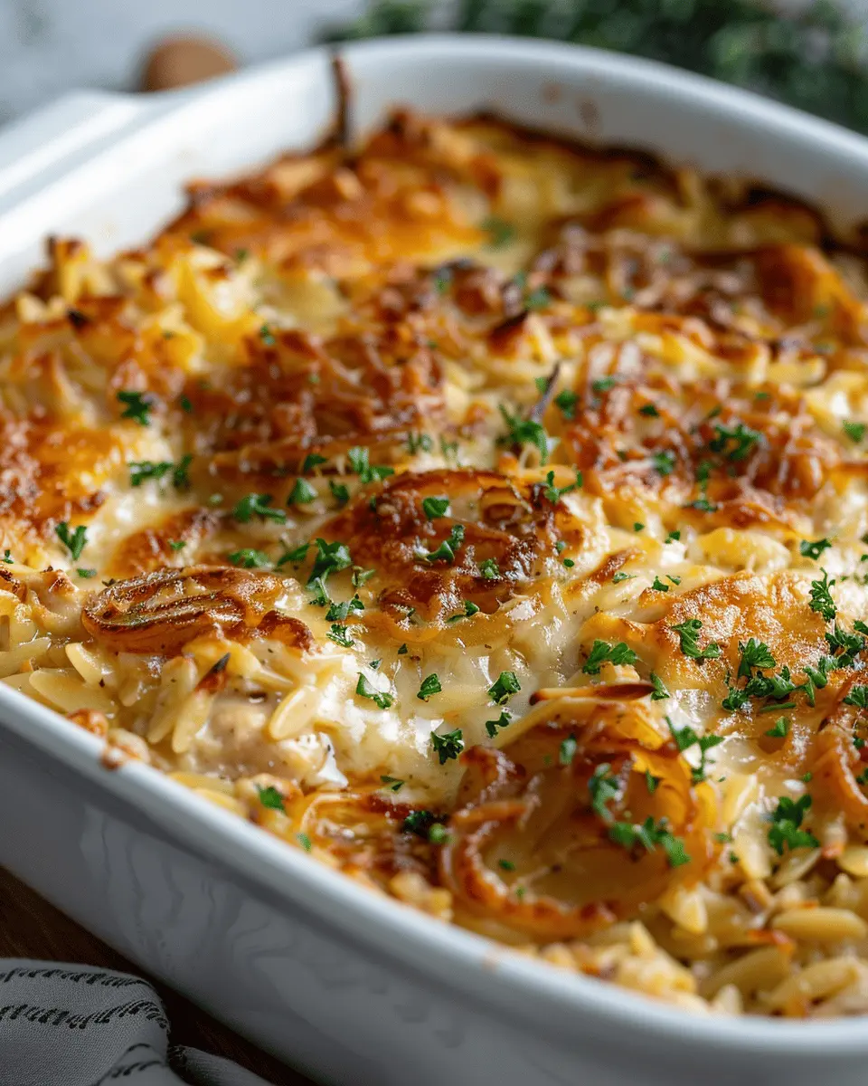 PrintFrench Onion Chicken Orzo Casserole: Easy Comfort Food Delight