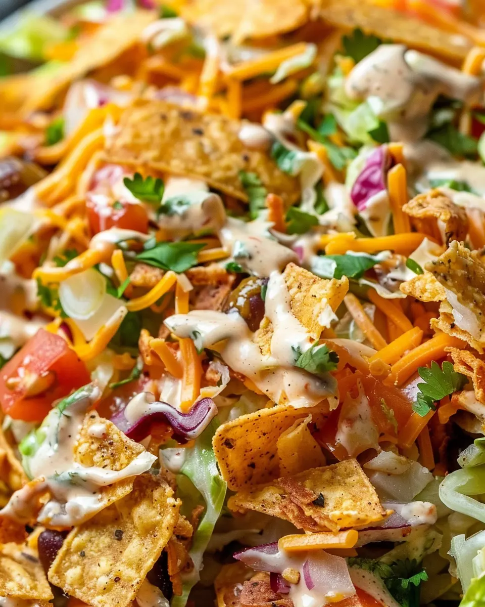 Just before serving, it’s time to add the finishing touch: the Fritos. While they can be mixed in before serving, keeping them separate until the last moment ensures that they retain their satisfying crunch. Add about 2 cups of Fritos into the salad mix and give it one last gentle toss.