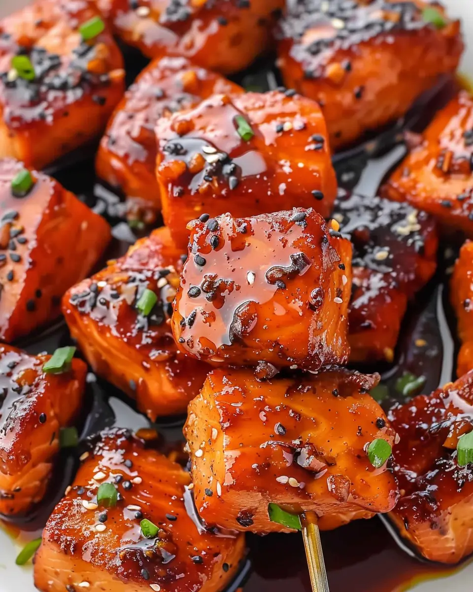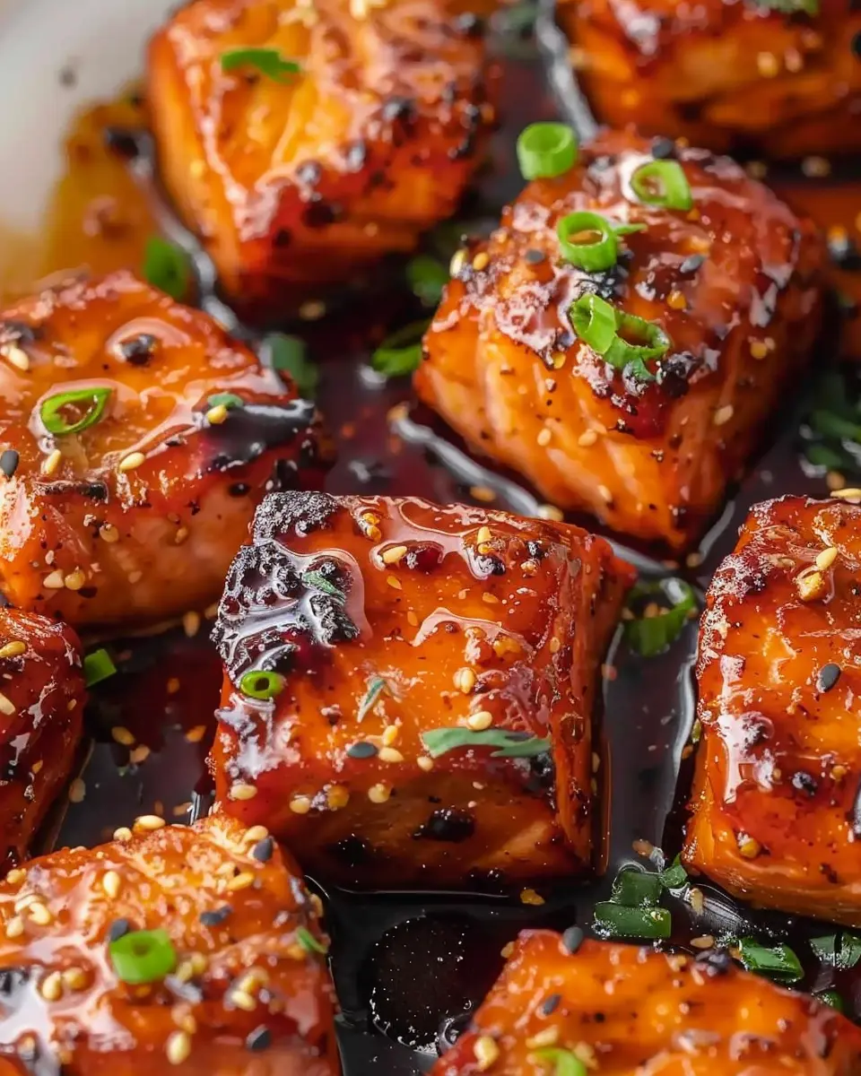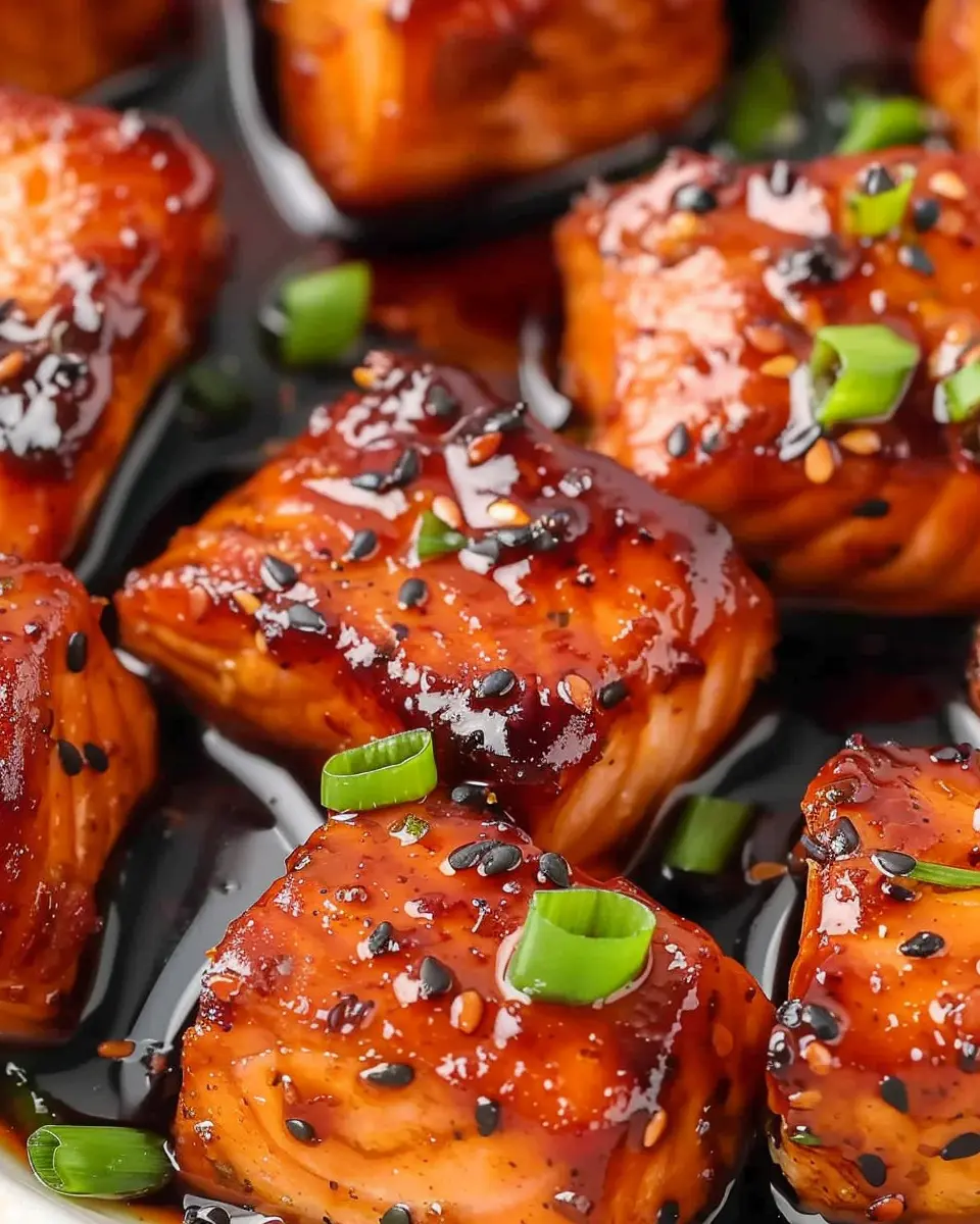 Drizzle the warm sauce over the salmon bites, ensuring each piece gets a generous coating. For added flair, toss in some sliced green onions and sesame seeds before serving.