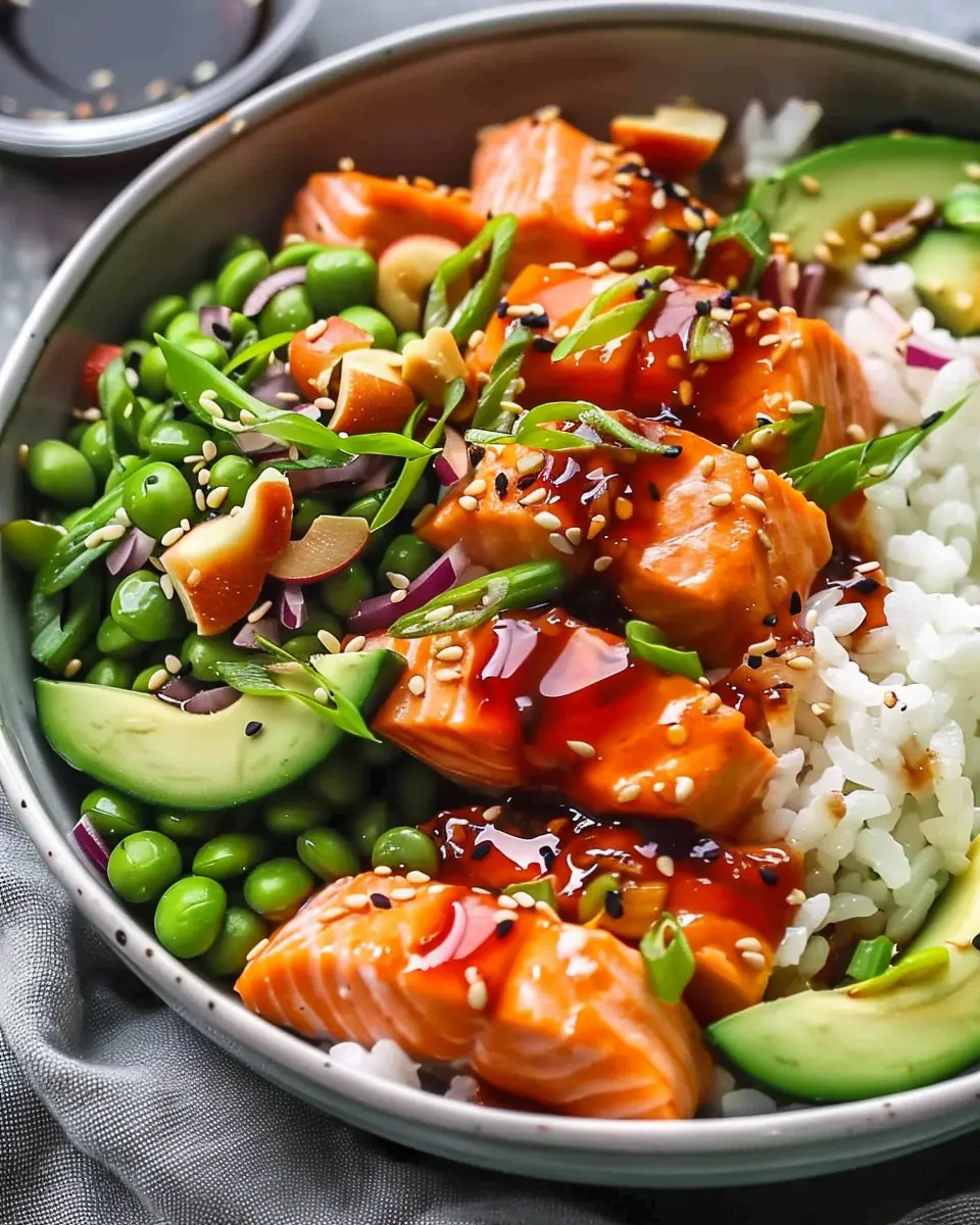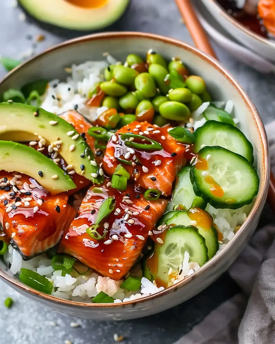 These Honey Sriracha Salmon Bowls are a perfect weeknight meal, balancing sweet and spicy flavors.