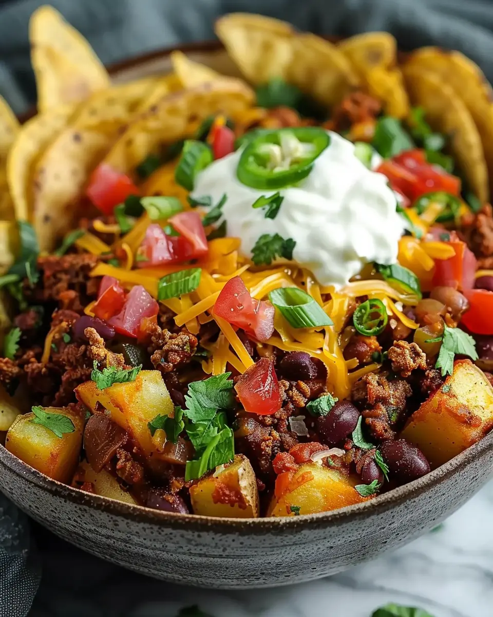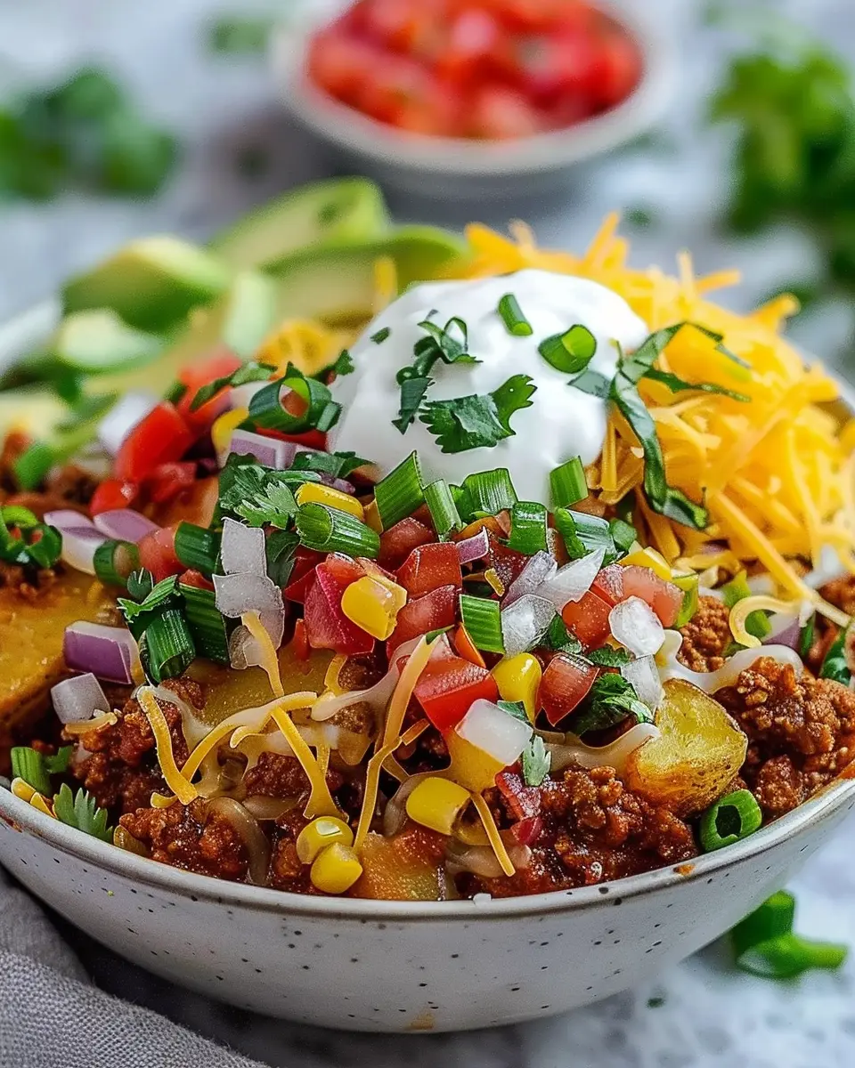 Whether you’re sharing this dish with friends or savoring it solo while binge-watching your favorite series, the loaded potato taco bowl stands out as a fun, delicious, and fulfilling option. So why not give it a whirl? You might just find yourself whipping it up multiple times a week!