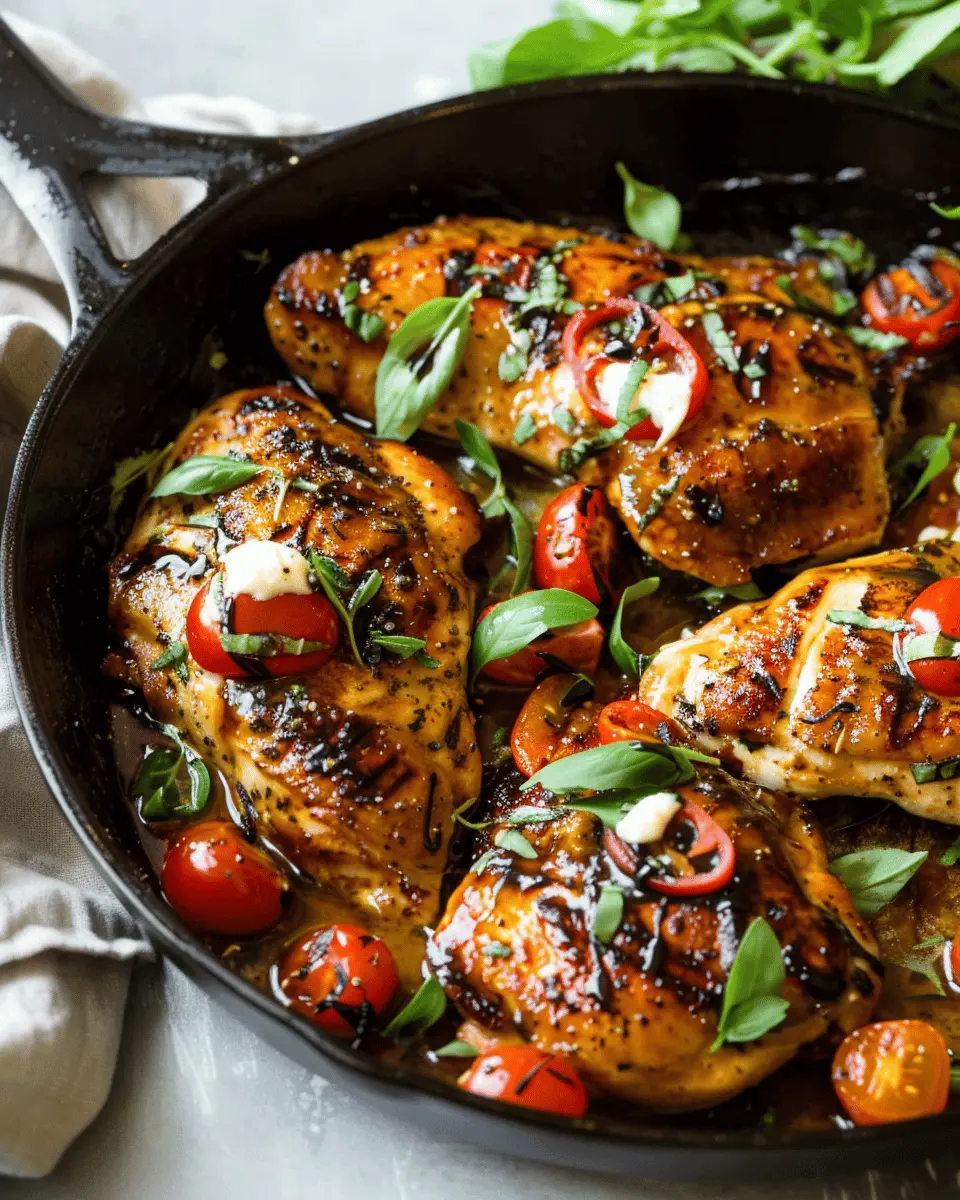 Finally, we’ll bring everything together. Pour the balsamic sauce over the seared chicken and then add the tomato mozzarella mixture on top. Ensure the chicken is nicely coated with the sauce.