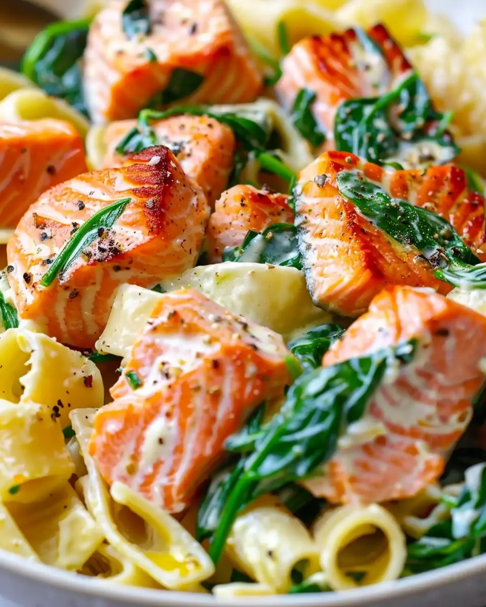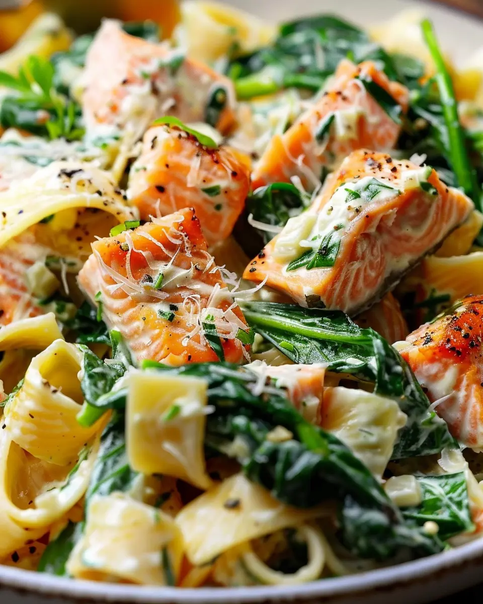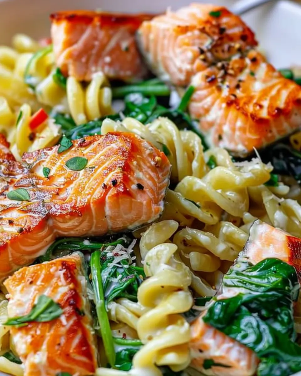 A savory and nutritious salmon spinach pasta dish that is simple to prepare, perfect for home cooks looking for a flavorful meal.