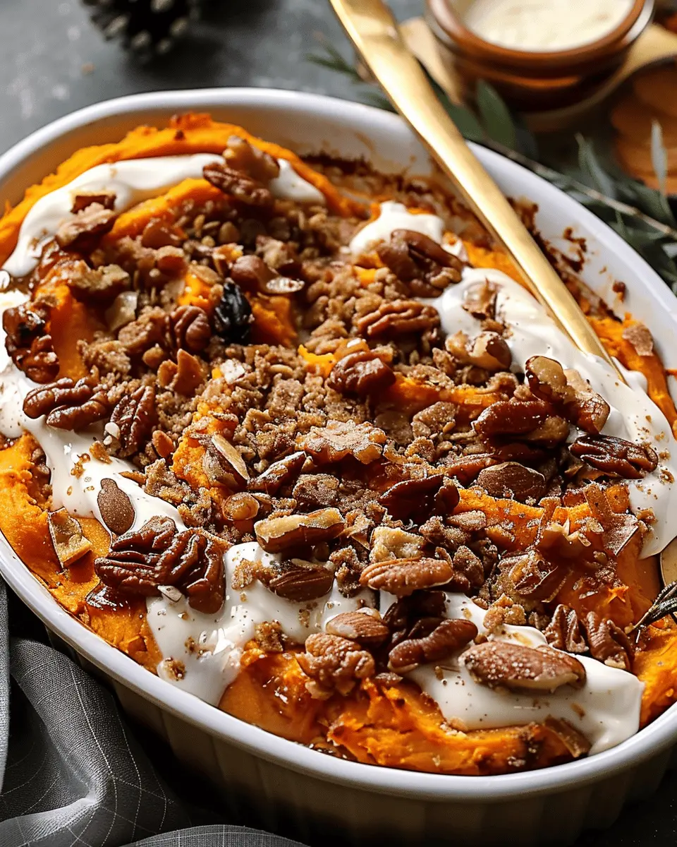 Southern Maple Sweet Potato Casserole with a Pecan Crumble