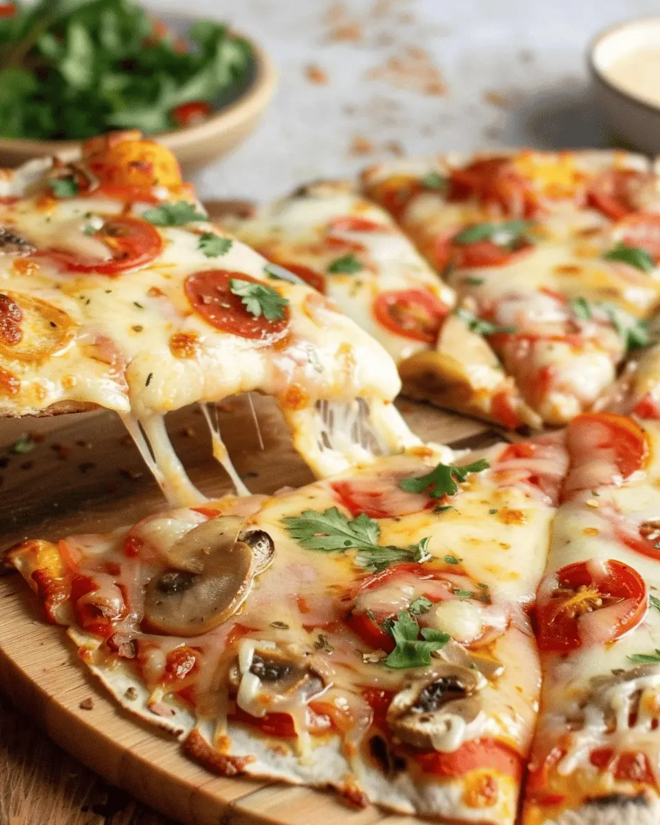 Next up, let’s discuss how to present the stars of your meal—your tortilla pizzas. Cut them into fun shapes using a pizza cutter or a sharp knife; triangles are classic, but why not try hearts or stars for a playful touch? Serve them on a wooden board sprinkled with fresh herbs for that rustic look. You can even personalize each pizza with BBQ sauce, pesto, or different toppings, allowing your guests to create their own masterpiece.