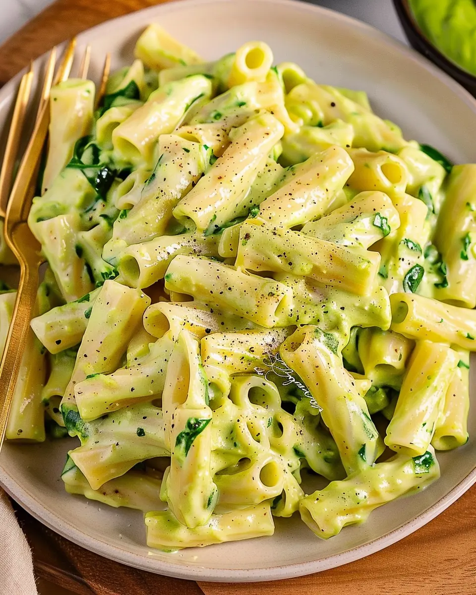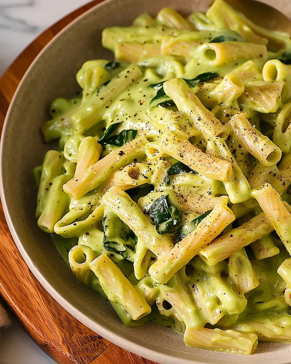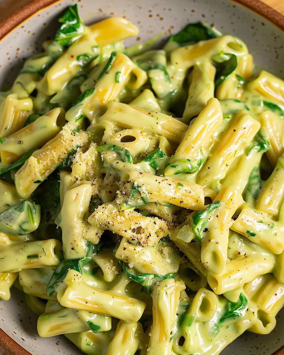 A delicious, creamy pasta dish featuring rich spinach and garlic flavors, perfect for a comforting meal.