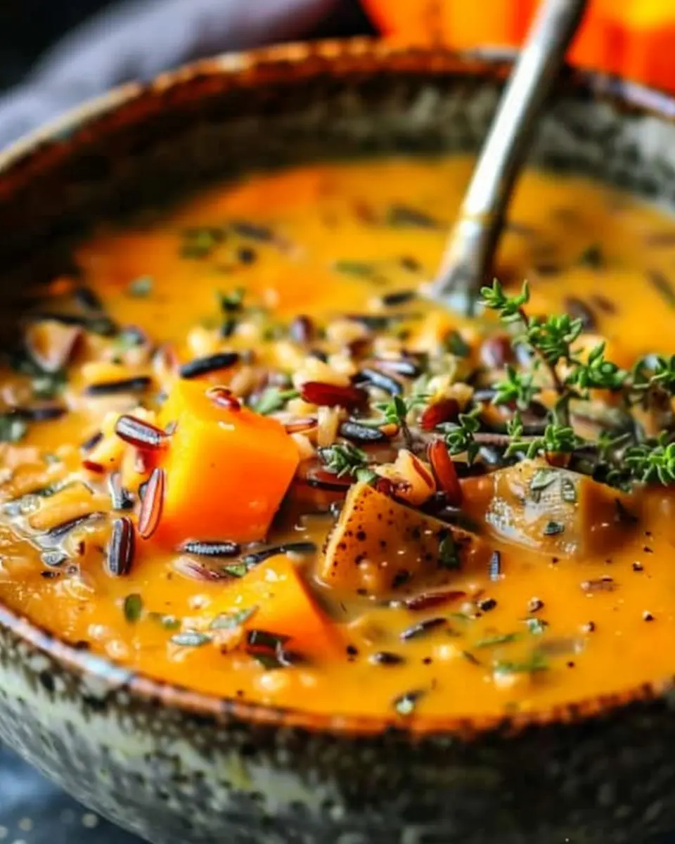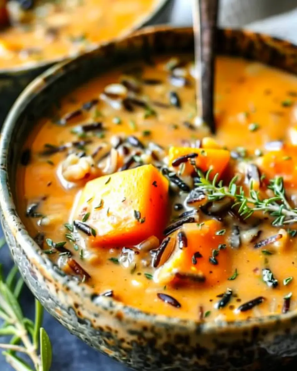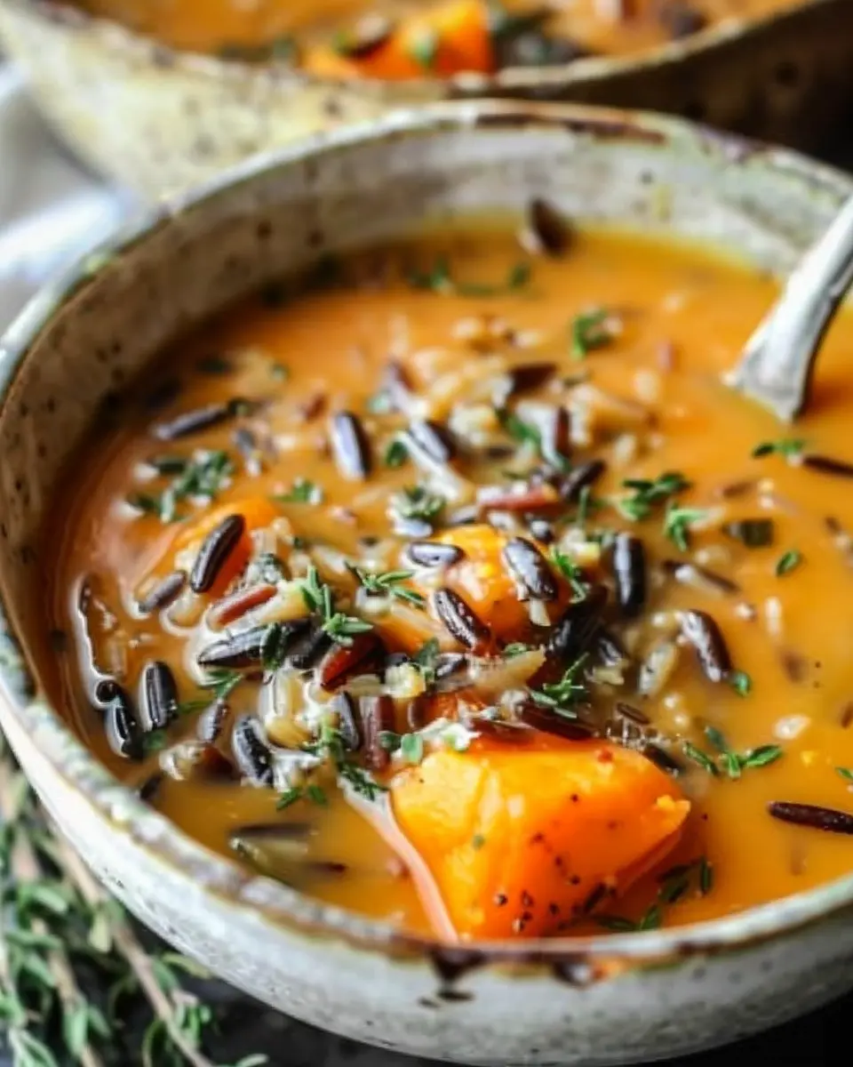This creamy and hearty soup is perfect for chilly days, featuring pumpkin and wild rice for a warm and inviting meal.